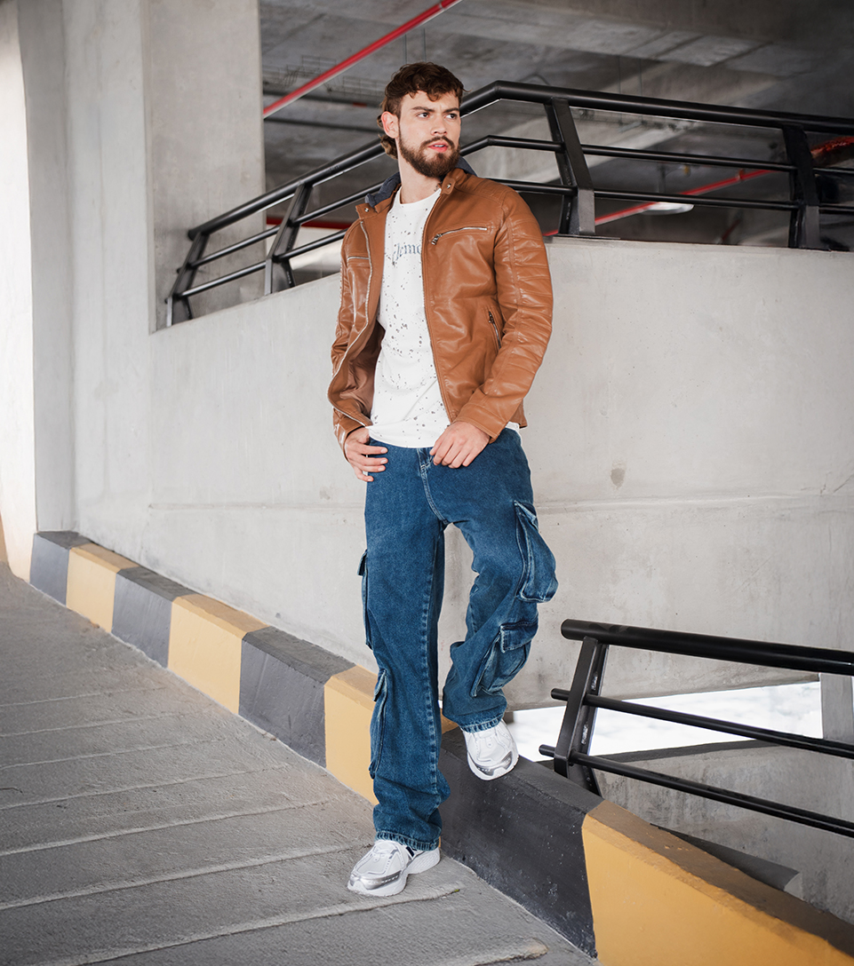 El look Steel Pulse proyecta una energía firme y contemporánea inspirada en la fuerza urbana. La chaqueta en polipiel Unser marca presencia con un acabado estructurado, mientras la camiseta Clemont Macchia y los jeans cargo Typeraportan equilibrio y movimiento. Los tenis New Balance cierran la propuesta con un toque dinámico y moderno.