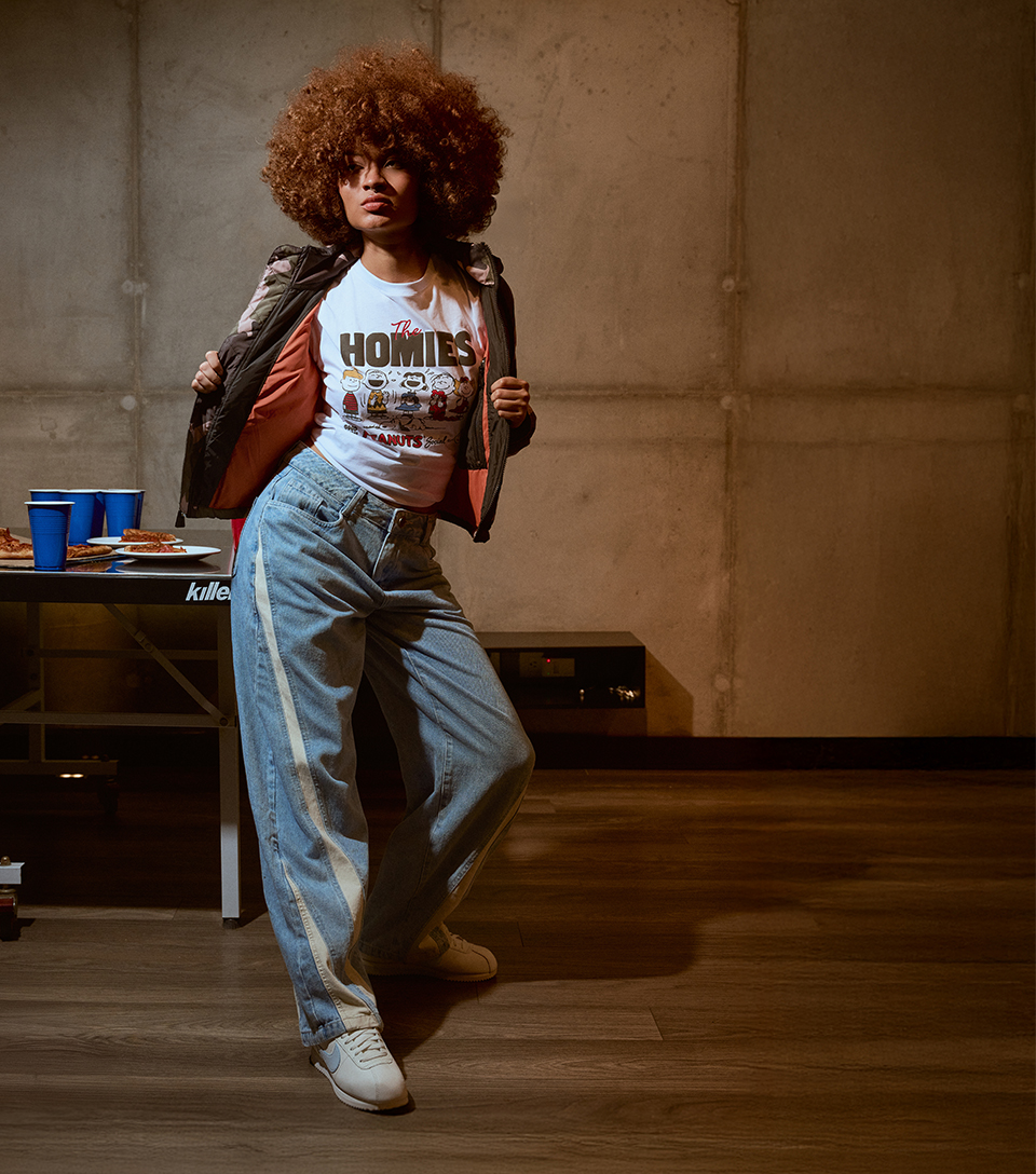 La mezcla ideal entre comodidad y carácter: jean Emily Typer y camiseta Laury Peanuts Unser que ponen la base relajada, mientras la chaqueta Branna Groggy y los Nike Cortez sellan un look fresco con toda la energía del Cool Gang Club.