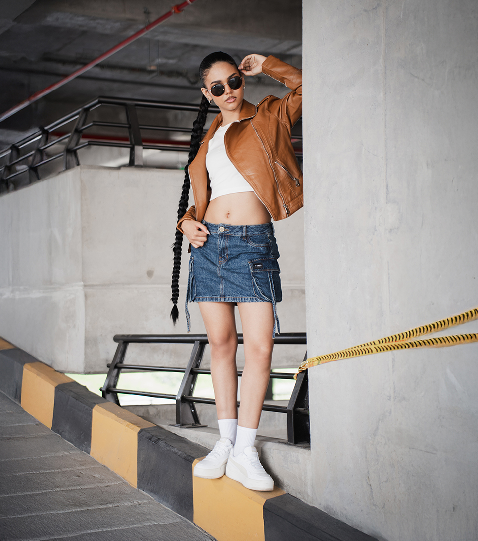 Amber Frame equilibra la fuerza y la sofisticación con una silueta moderna y actitud urbana. La falda tipo cargo y la chaqueta en polipiel crean un contraste entre estructura y fluidez, realzado por las gafas Ray-Ban que aportan carácter. Los tenis Puma completan el look con un aire contemporáneo y funcional.