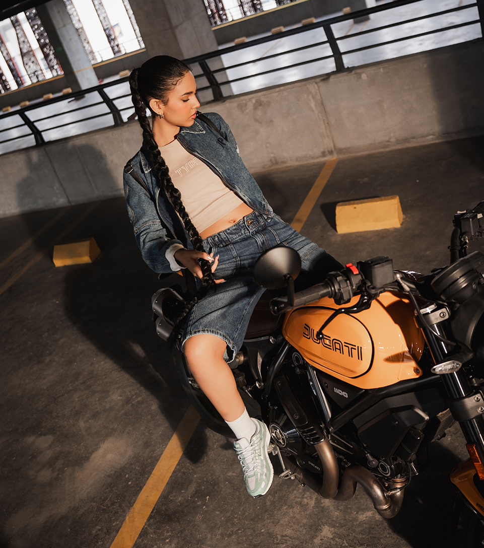 El look Denim Racer captura la esencia del movimiento con una estética industrial y fresca. La chaqueta boxy Valeria y las bermudas en índigo Derek crean un equilibrio entre estructura y libertad, reflejando una actitud auténtica. Los tenis Nike V2K Run completan el conjunto con un toque dinámico y contemporáneo.