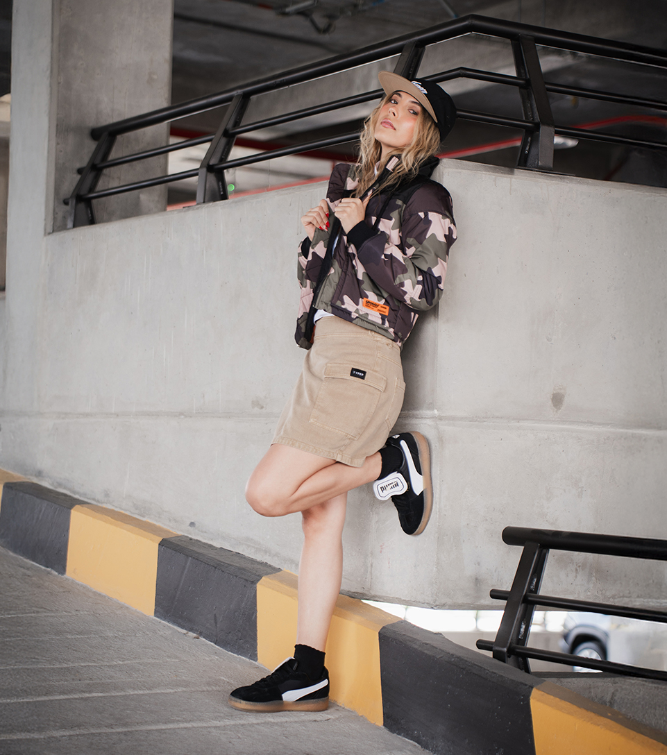 El look Urban Voltage combina la energía de la ciudad con un estilo audaz y moderno. La chaqueta acolchada Groggyy la falda asimétrica Typer crean un contraste entre fuerza y movimiento, mientras la gorra estructurada y los tenis Puma Palermo Premium completan una propuesta urbana llena de actitud y dinamismo.